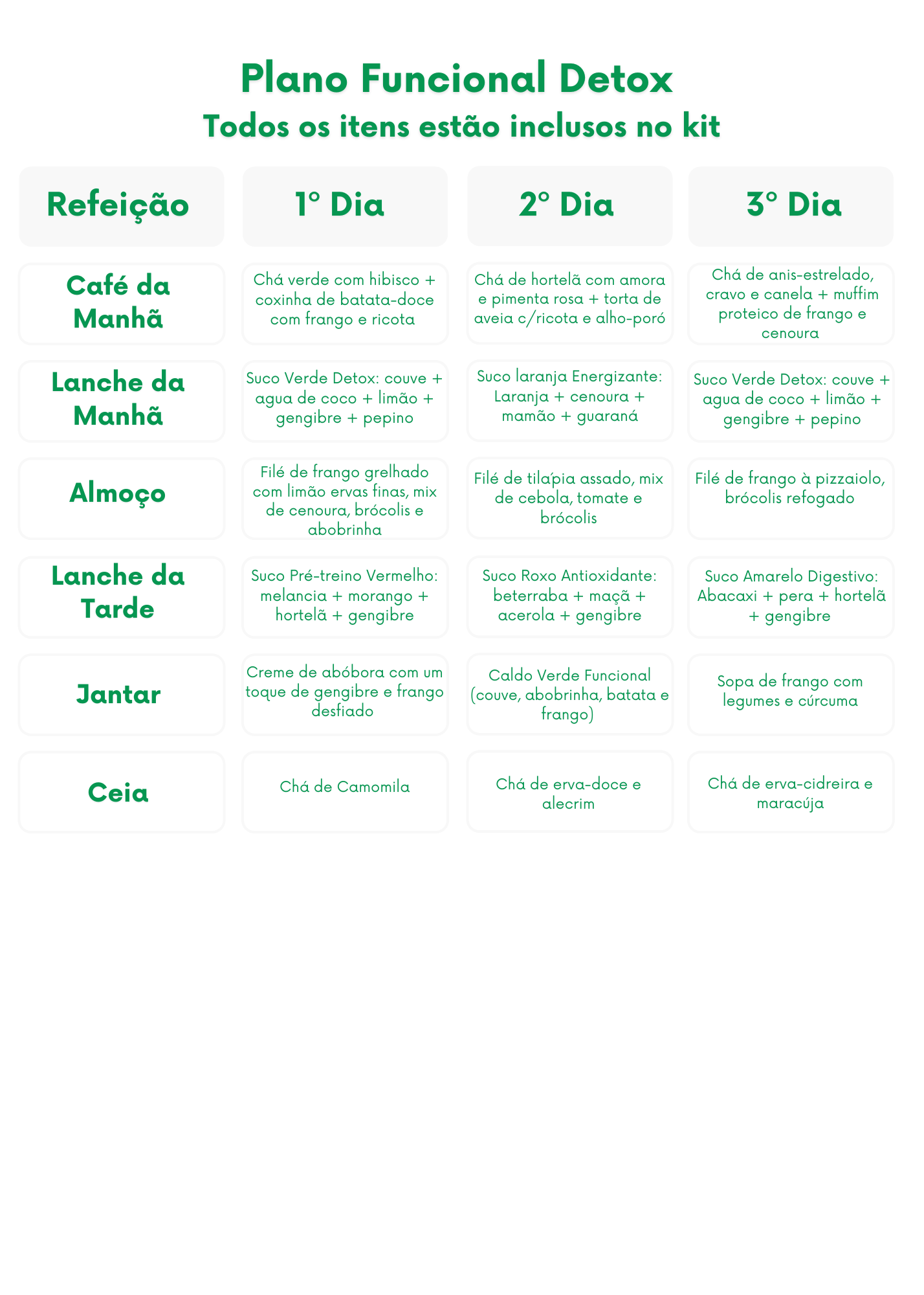 São 3 dias de refeições completas, pensadas para dar um descanso ao corpo e permitir que você retome seu ritmo com mais leveza e bem-estar.